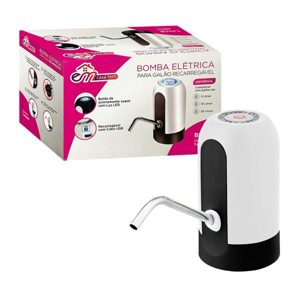 A Bomba Elétrica Recarregável para Galão de Água é ideal para quem busca conforto e agilidade no dia a dia. Com um design moderno nas cores preta e branca, ela é compatível com galões de 10L, 20L e até 20L retornáveis, tornando o consumo de água muito mais prático, higiênico e sem esforço.
