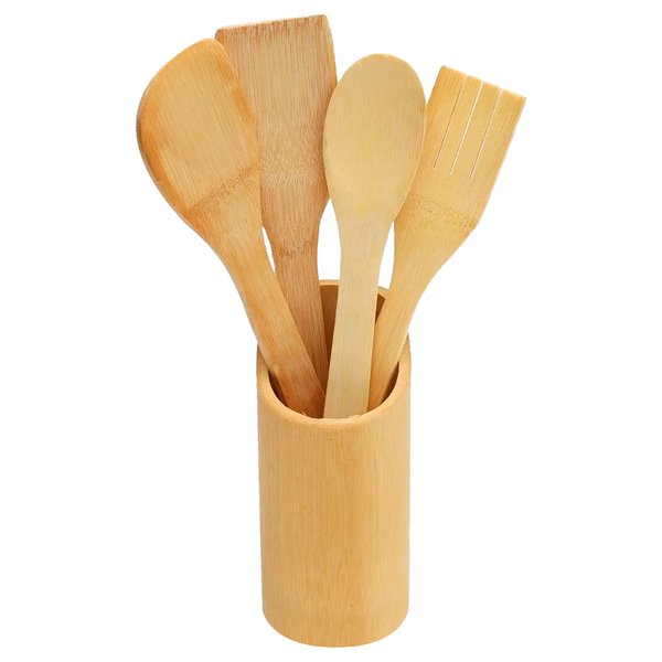 Kit 4 Utensílios em Bambu com Suporte – Colher, Garfo e Espátulas de Madeira