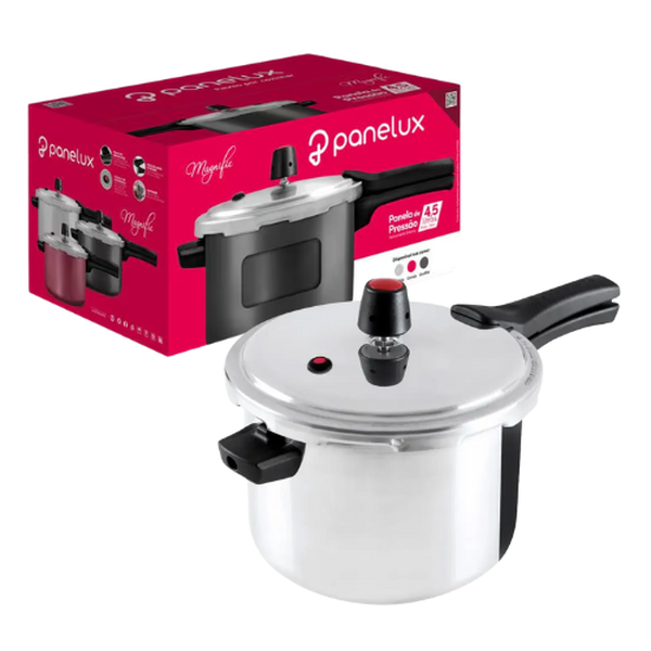 Alta performance, segurança e praticidade na sua cozinha! A Panela de Pressão Panelux Magnific com 4,5L de capacidade é fabricada em alumínio de excelente qualidade e conta com revestimento interno antiaderente PTFE de Classificação A, que proporciona cozimento mais rápido, uniforme e saudável, com pouquíssimo ou nenhum óleo.